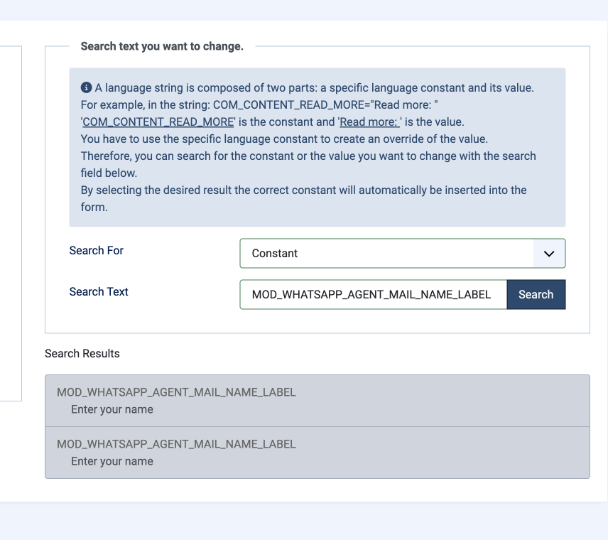 Hello, sorry for the delayed response, I missed your post earlier. Regarding the language override issue, I’ve tested it and it works. There are two MOD_WHATSAPP_AGENT_MAIL_NAME_LABEL strings there; are you sure you have translated both of them?